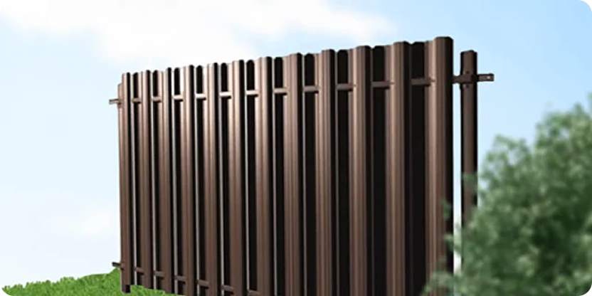 Эстетичный и функциональный забор из вертикальных стальных планок. Пропускает свет, так необходимый растениям на участке. Стилизуется под дерево и другие материалы.